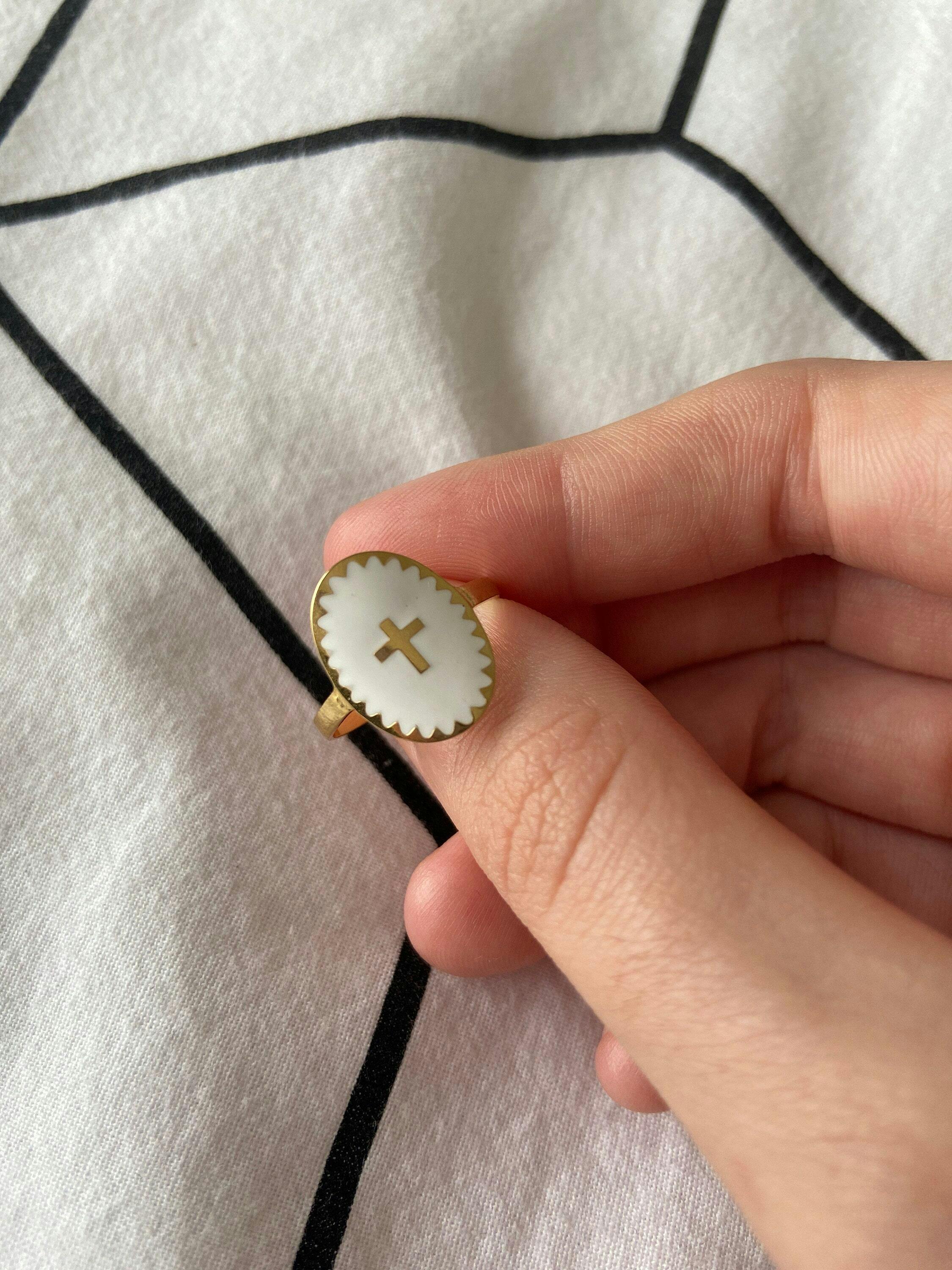 - Ornée d'une pastille ovale en émail de couleur avec une croix dorée