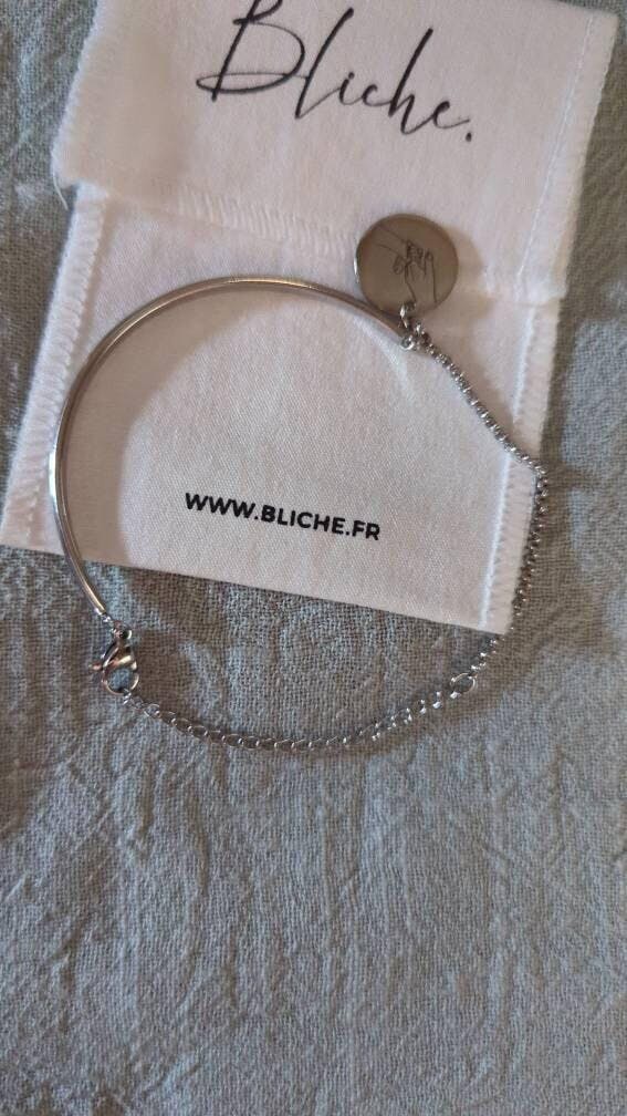 Ce bracelet personnalisé femme demi-jonc est la parfaite alliance entre modernité et délicatesse. Son design minimaliste est sublimé par une médaille à graver en acier inoxydable, pour créer un bijou à forte valeur émotionnelle. Que ce soit pour célébrer une naissance, un anniversaire ou simplement pour faire plaisir, ce bracelet charms est une attention qui marque les cœurs.